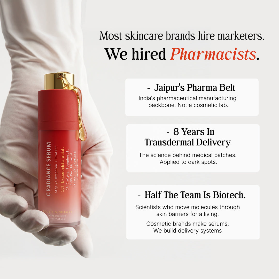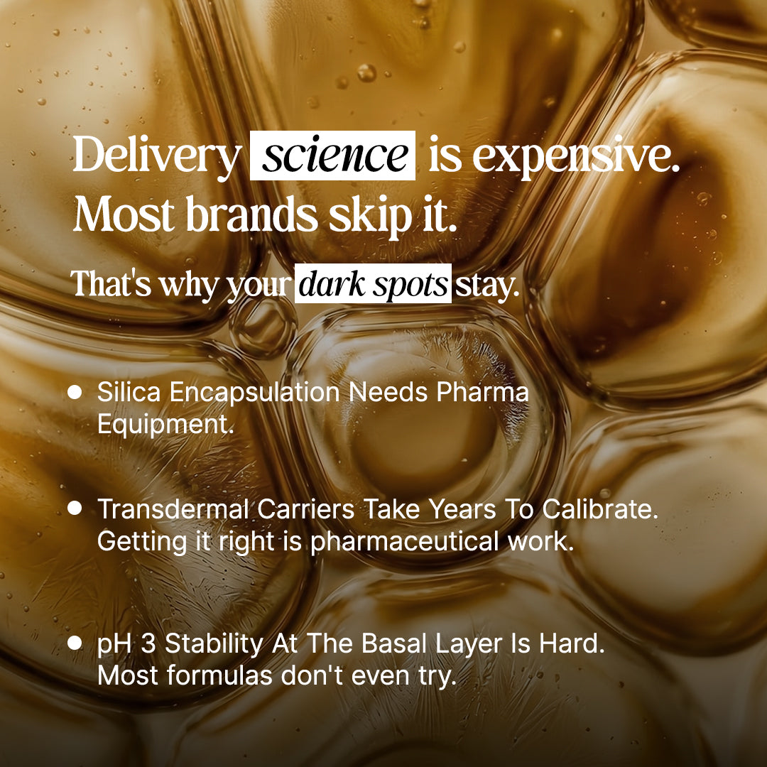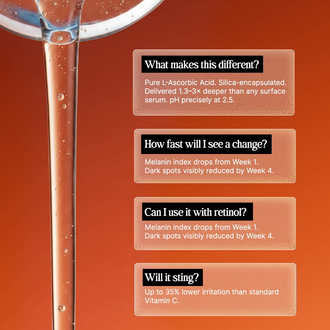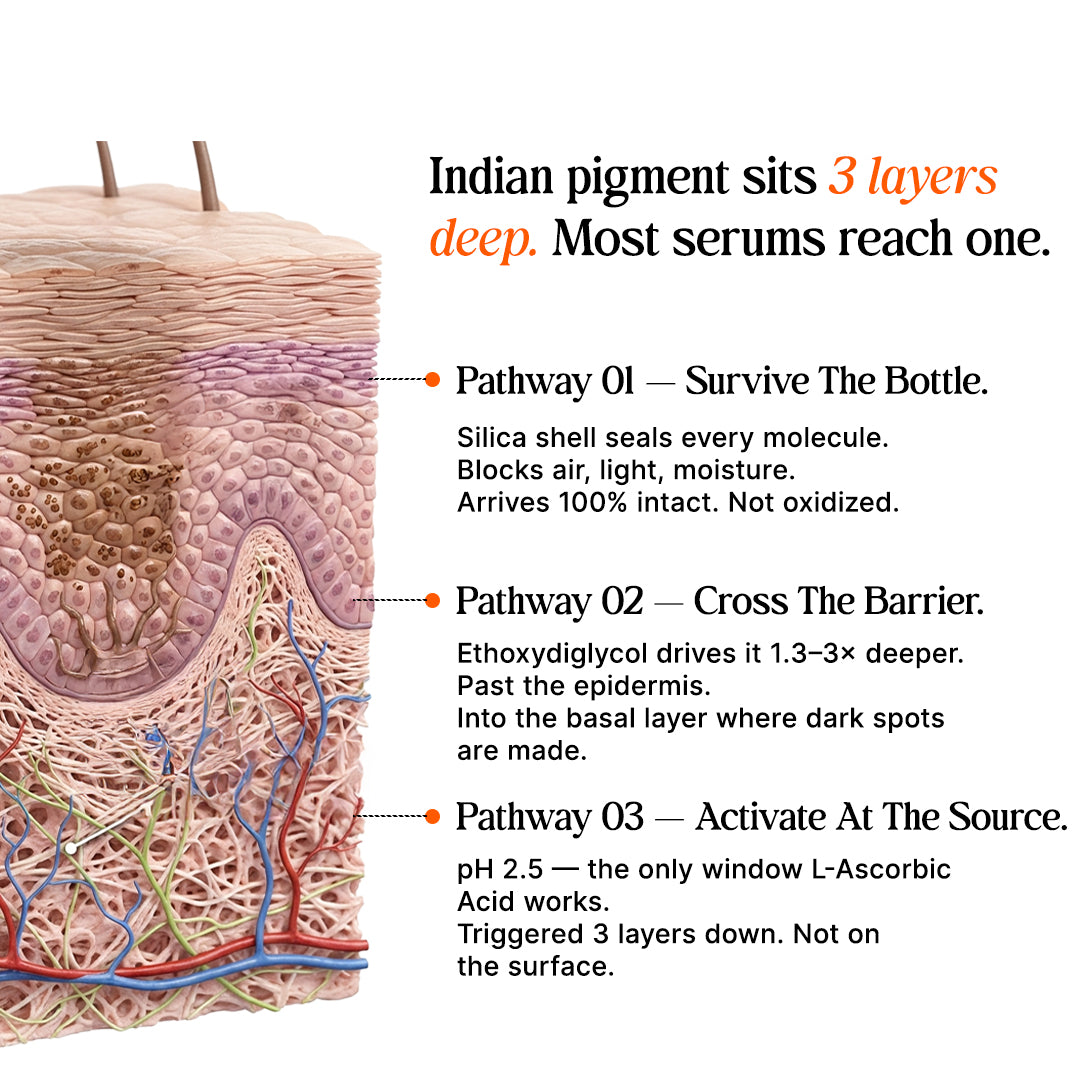 It starts with 15% Pure L-Ascorbic Acid — the most proven form of Vitamin C to fade pigmentation and boost collagen.