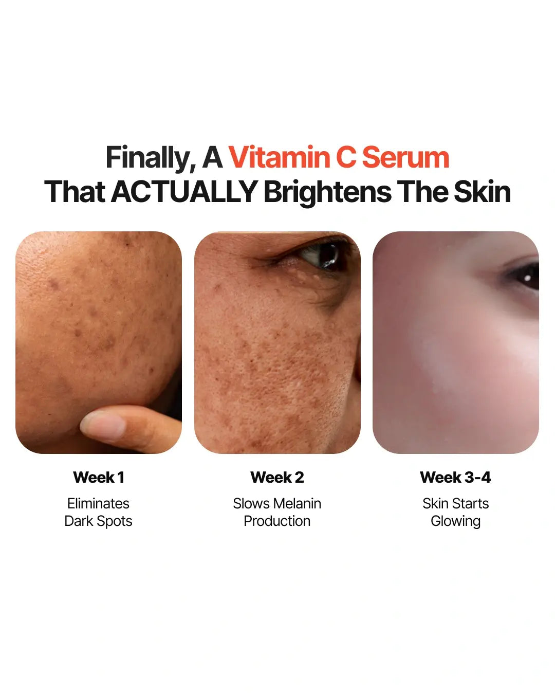 It starts with 15% Pure L-Ascorbic Acid — the most proven form of Vitamin C to fade pigmentation and boost collagen.